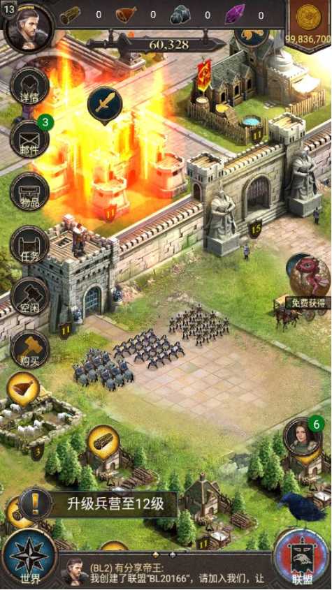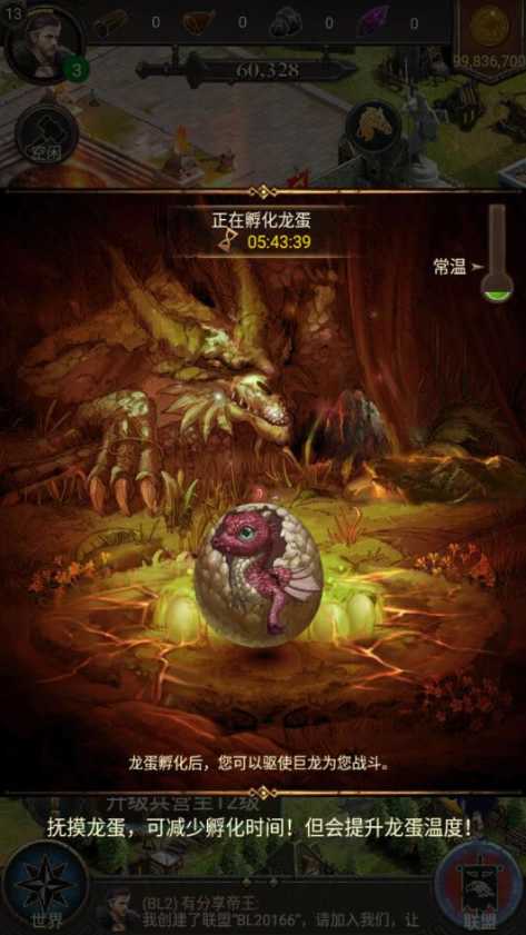 骑着巨龙,调度你的军队,占领地盘,步步为营,复兴你的王国!废墟之上,睿智沉稳的士官,美丽机敏的内政官,勤劳的农民和忠诚的士兵都在等待你的到来。那角落中隐隐发光的龙蛋似乎预示着你的使命。游戏特色: 在一片废墟之上重建城堡,城堡外观会随着等级提升不断繁荣,你甚至可以建设不同风格的城堡, 组建属于你的军队,搭配不同兵种,选取不同指挥官,你的宠物龙也听候差遣 ,孵化龙蛋,养育幼龙,随着它体型的增大,实力也会越来越强,和其他玩家一起建立同盟,抢占世界地图上的地盘。