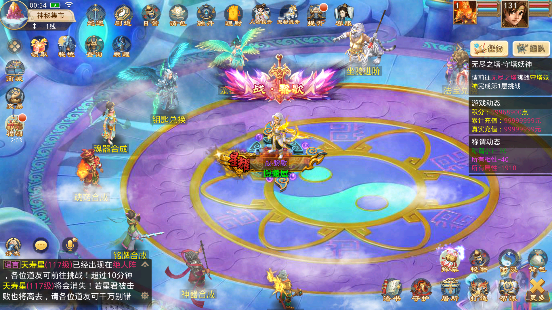 元素洗炼,可用元宝或者灵符洗炼,随机获取最大攻击,生命,防御…的1%–10%,核心氪金功能